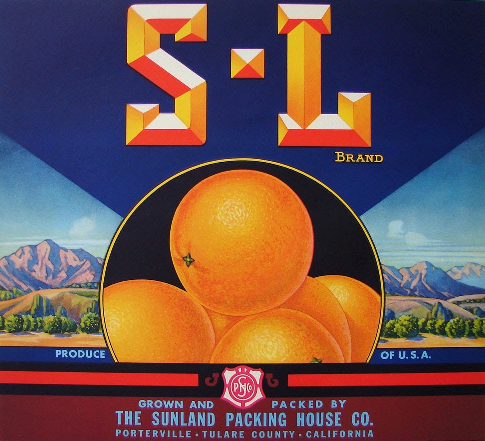 Part 5 of citrus fruit crate labels from the USA, from the 1940's - 1950s, and a few undated ones. These colourful illustrated labels were printed by lithography and were designed to be attached to the ends of wooden fruit crates. They usually identified the manufacturer, the type, class and origin of the fruit. Some were generic - overprinted by different companies or brands.